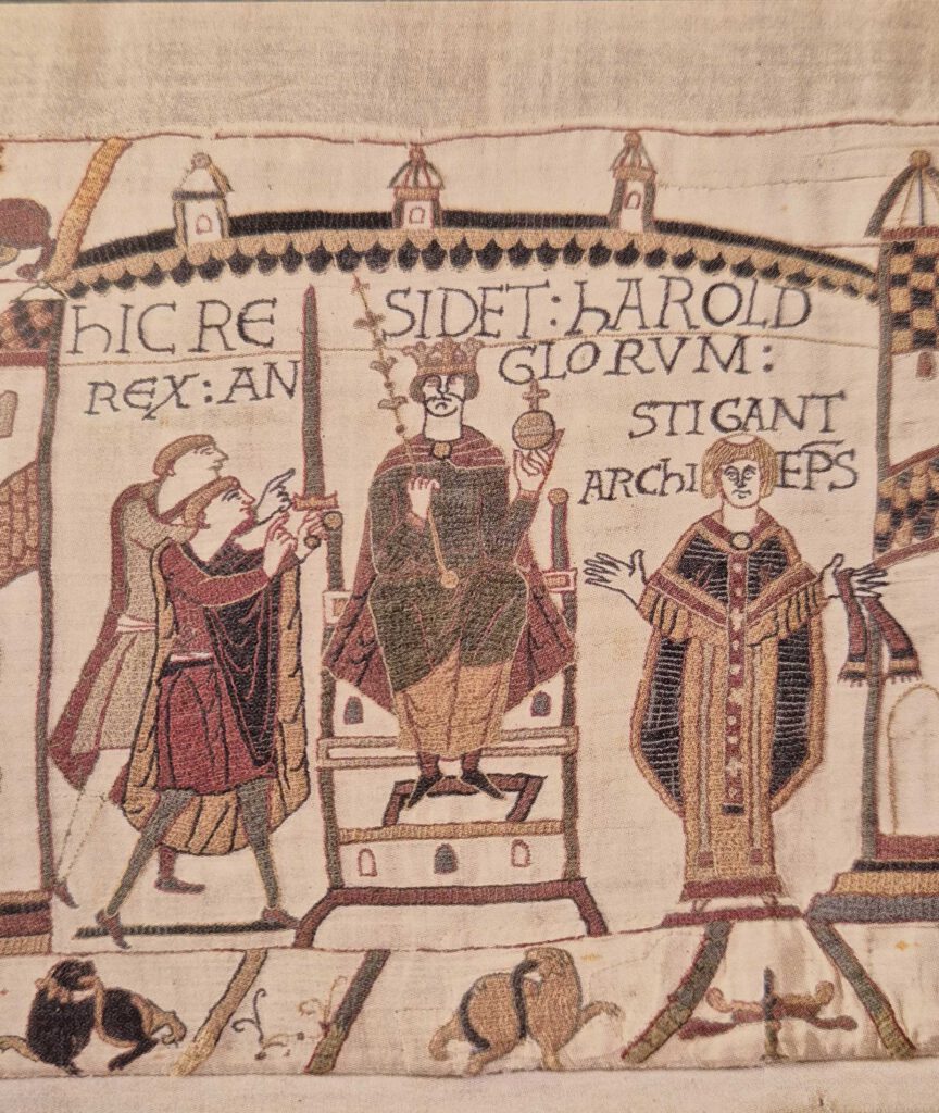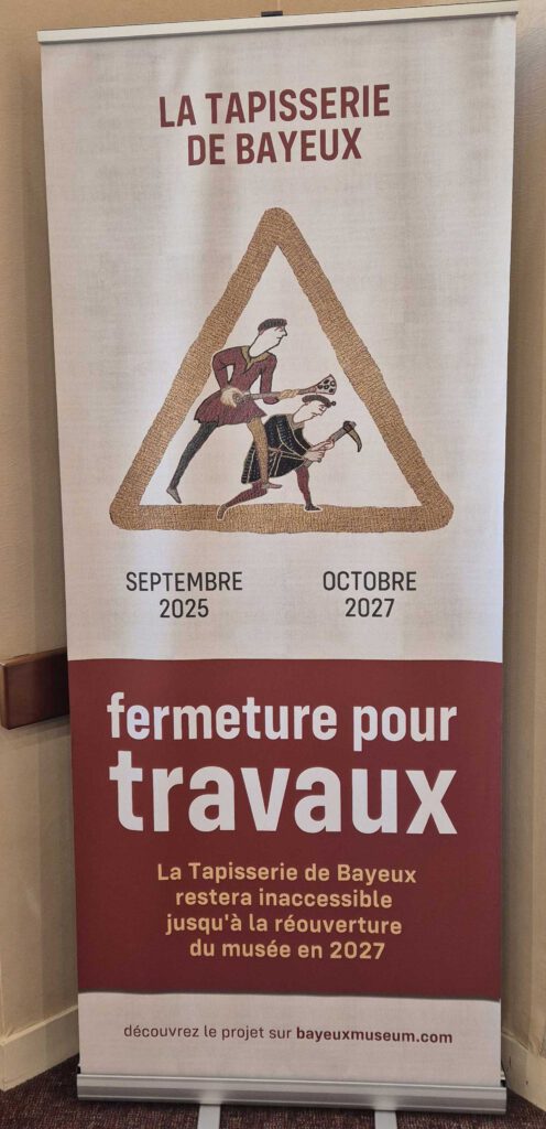 Noch ein Highlight (ja, davon gab es viele): der Besuch des Musée de la Tapisserie in Bayeux. Der über 70 Meter lange, handgearbeitete Teppich von Bayeux erzählt wie ein mittelalterlicher Comic die Geschichte der normannischen Eroberung Englands im Jahr 1066. In langen Bildstreifen folgt man Wilhelm dem Eroberer und seinem Rivalen Harald Godwinson: Man sieht Bündnisse, politische Ränkespiele, die Überfahrt über den Ärmelkanal und schließlich die berühmte Schlacht bei Hastings. Zwischen Rittern, Pferden, Schiffen und festlichen Szenen laufen oben und unten kleine Tiere und Fabelwesen mit – fast so, als würde jemand nebenbei noch Randnotizen zeichnen. So entsteht ein lebendiges, manchmal erstaunlich alltägliches Bild dieser großen historischen Wende. Dieses beeindruckende Werk ist nun für zwei Jahre in der Restaurierung – wir hatten das Glück, es zuvor bewundern zu können. Übrigens: Fotos waren zum Schutz des wertvollen Kulturerbes nicht erlaubt, daher gibt es nur einen kleinen Postkartenausschnitt in unserer Bildergalerie 😉